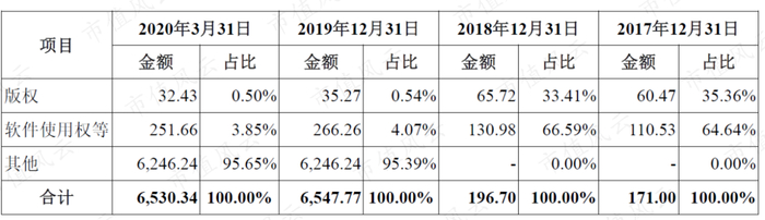 公司固定资产规模有限,我们主要来看无形资产。截止2019年末,无形资产6500余万元,但当中并不是专利技术、客户关系,甚至版权、软件使用权都很少,而是“其他”。