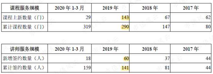 以在线课程为例,2019年,公司课程上新数量同比增长超100%,新签约讲师数量也从37人增长到60人。