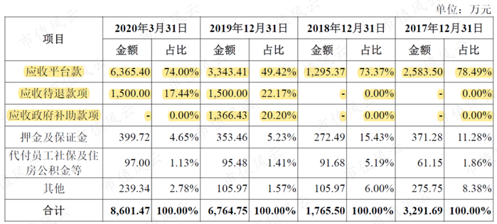 公司其他应收款较高,以2019年末为例,约6600万元,占总资产的5.3%,主要包括应收平台款、应收待退款以及政府补助。
