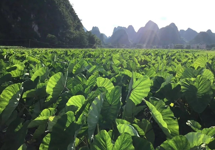 都说桂林山水甲天下,来到荔浦芋头的万亩种植园,自然水田遍布、石山峰林环绕,环境更是纯净天然。