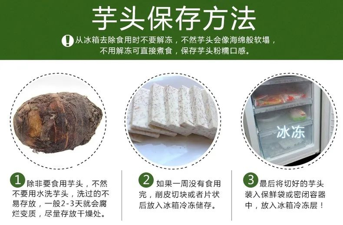 c.食用时不要解冻,可直接蒸、煮、炸等,否则芋头会像海绵一样软塌。