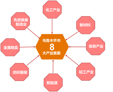 乌鲁木齐在产业发展方面,紧抓国家培育和发展战略性新兴产业的机遇,结合丝绸之路经济带核心区建设有利时机,围绕产业发展战略,重点推进八大产业集聚。根据《关于加快乌鲁木齐市工业重点产业集群发展的意见》,乌鲁木齐主要打造化工、先进装备、新材料、新能源、信息、轻工业、金属制品、纺织服装八大产业集群及产业集聚区。同时大力发展以新材料、新能源、高端装备制造、生物医药、智能终端、节能环保等为主的战略性新兴产业,打造产业集群,延伸产业链条,激活经济发展新动能。