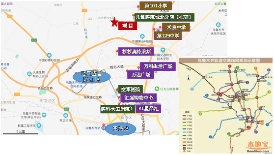 交通方面:城北新区构建多维立体交通路网,极大的提升了城市运转效率,将城北新区与乌鲁木齐乃至全国便捷对接,区域价值日益凸显。从外联交通来看,项目距离乌鲁木齐高铁站直线距离约14公里;从航空交通看,距离地窝堡国际机场直线距离约8公里,驾车约30分钟可直达机场;从城市道路看:目前城北新区“三纵四横”路网基本建设完毕,“三纵”是指北京路北延、长春路北延、文光路北延三条南北走向道路的建设;“四横”则是纬一路、纬三路、纬五路、东进场路四条东西走向道路建设。从公共交通来看:目前地铁一号线已建成通车,横跨城市南北,为城北片区带来人流同时,也拉长了城南的成熟资源辐射能力,扶持助力城北发展。片区还规划了地铁三号线和六号线。周边多维立体的交通使得项目便捷出行,区域交通潜力可期。