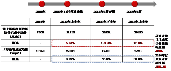 未来“恒大水世界”及“梦幻儿童世界”的成功落成运营将对项目长期价值有显著带动效应。通过对一些国内外典型主题乐园进行分析发现,大型游乐园对区域人口集聚、配套提升、消费升级等均有助推作用,从而对周边项目房价实现保值增值起到重大推动作用。以上海迪士尼为例,自2009年11月项目获批以来,截至2019年上半年其所在的川沙板块住宅成交价格涨幅超400%,远超上海市整体房价上涨速度。