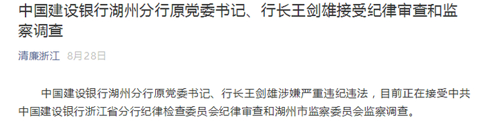 而在一个月前的8月28日,清廉浙江发布消息,中国建设银行湖州分行原党委书记、行长王剑雄涉嫌严重违纪违法,目前正在接受中共中国建设银行浙江省分行纪律检查委员会纪律审查和湖州市监察委员会监察调查。