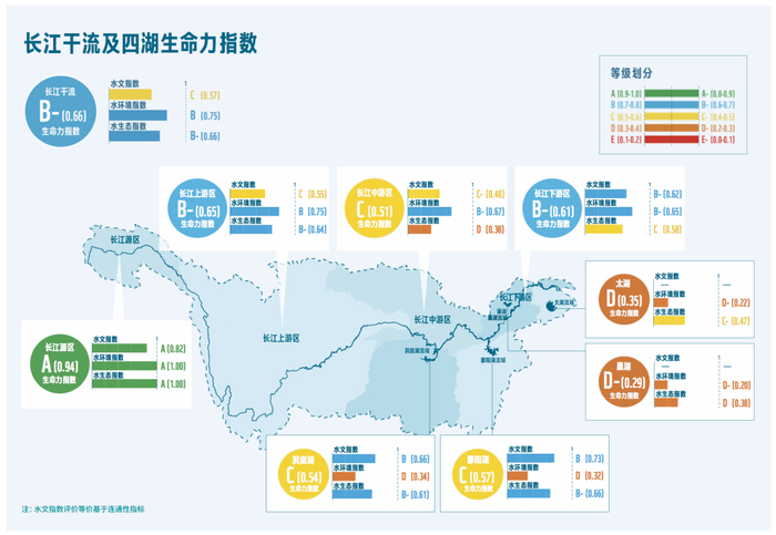 马可·兰博蒂尼所说的全球一个完整的流域级指数即为长江生命力指数,作为报告的核心,该指数将诸多的指标进行了梳理、选取了具有代表性、指示性、简洁性、可追溯、且可持续跟踪的指标,从水文、水环境、水生态三个维度综合反映长江淡水生态系统的健康状态。指数评价的主要结论为 ,长江的整体健康状况为B-,并随着人类活动显示区域差异性。