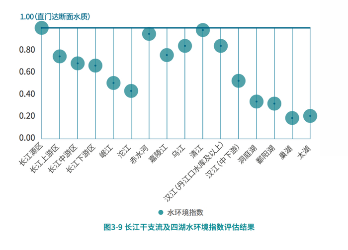 生态环境部环境规划院的续衍雪对此进行了解释,“我们选取了长江流域主要河流湖库水质监测断面,对氨氮、总磷及高锰酸盐指数3项代表水体营养和有机污染物质的指标进行计算,得出各个区域(干流河段、主要支流、四湖等)水环境指数,并对其进行评价,水环境指数越高则代表水体受污染程度越轻,水质越好;水环境指数越低则代表水体受污染程度越高,水质越差”。