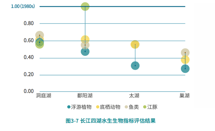 水生态指数主要评估长江干流与四湖(即洞庭湖、鄱阳湖、巢湖、太湖)水生生物的丰富性、多样性和群落结构,以及栖息地状况。水生态是生命力中“活”的部分,它的指数高低直接体现了长江是否还有活力,有多大的活力。
