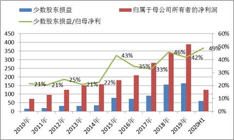 我们先看一组数据,少数股东损益与归母上市公司之比,2010年至2019年及2020H1,该指标分别为21%、21%、25%、21%、22%、43%、35%、33%、46%、42%和49%。从数据可以看出,2014年之前,该指标占比平均维持在22%左右的水平,2015年之后,该指标平均维持水平超过40%,完整财年最高达46%。换言之,优质的万科产生的利润,少数股东能够分享的利润从此前占归母上市公司净利的两成上升至占比超四成。
