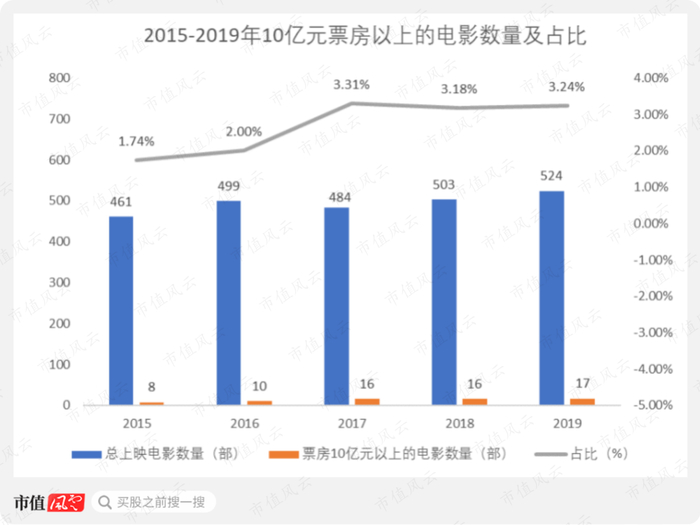 以中国为例,2015-2019年,中国内地上映的电影数量从461部增加到524部,其中,票房在10亿元以上的电影数量从8部增加 到17部,10亿元级别的电影数量占总上映电影数量的比例从1.74%增长至3.24%,虽然增幅有限,但是依然在增长。