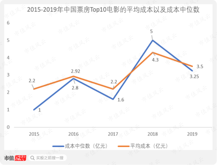 以同样的方法,风云君计算出了2015-2019年,中国票房Top10电影的平均成本以及成本中位数。我们可以看到,大片的整体门槛确实是越来越高的,平均成本从2015年的2.2亿元增长至2019年的3.5亿元,同期成本中位数也从1亿元增长至3.25亿元。