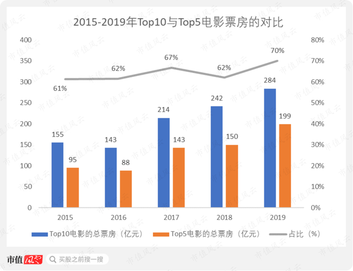 2015-2019年,票房Top10电影的票房总收入从155亿元增长至284亿元,Top5电影的票房总收入则从95亿元增长至199亿元。后者占前者的比例从61%增长至70%。