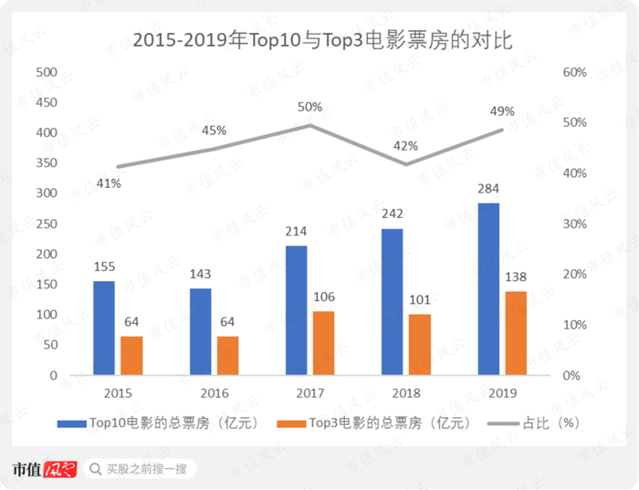 同期,Top3电影的票房总收入从64亿元增长至138亿元,占Top10电影票房的比例从41%增长至49%。