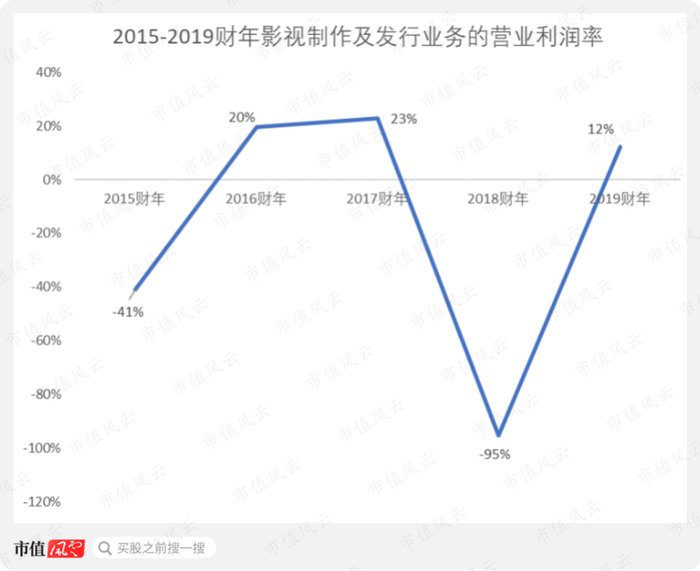 影视制作及发行业务的营业利润率也起伏比较大,走势极为难看,其中2018财年的营业利润率竟为负的95%(具体原因风云君会在后面进行分析),2015财年的营业利润率也为负的41%。
