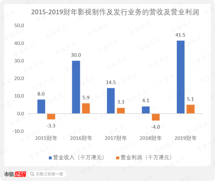 如果把时间拉长我们可以看到,2015-2019财年影视制作及发行业务的营收波动比较大,营业利润的波动也比较大。营收最高为4.2亿港元,最低仅为4100万港元,营业利润最高为5900万港元,最低为负的4000万港元。