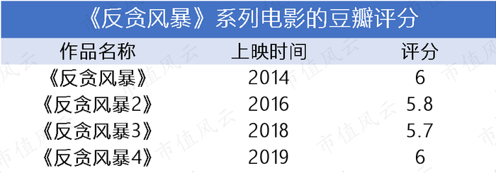如下图所示,实际上从《反贪风暴1》到《反贪风暴4》,其豆瓣评分都落在及格线附近。对于一部中规中矩的港式商业片,不能期望太高。