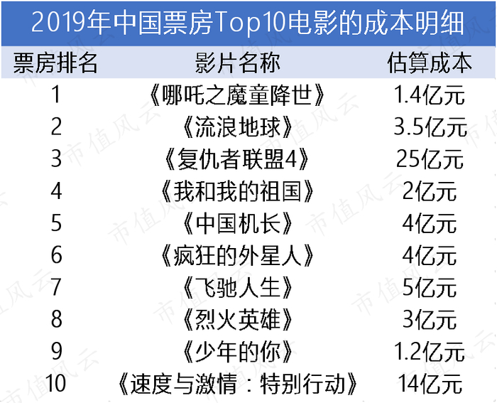 当然了,这两部影片是好莱坞生产的、面向全球市场的超级大片,大市场,大投入可以理解。要是除开这两部,剩下的8部影片,平均成本高达3亿元,成本中位数为3.25亿元。