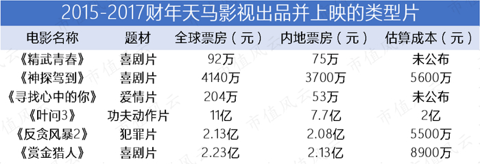 2017财年,由天马影视出品的两部电影上映,分别是《反贪风暴2》和《赏金猎人》。