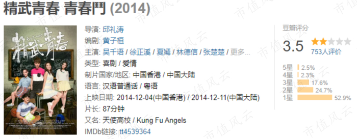 《精武青春》内地票房75万元,香港票房17万元,这票房体量小得和艺术片有一拼,豆瓣评分3.5,无疑是烂片了,幸好本片成本低,拍摄周期才1个多月,亏也亏不了多少。