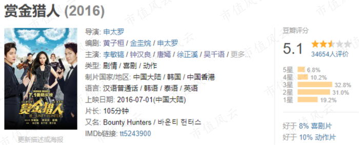 虽然是烂片,但必须承认《赏金猎人》最后还是盈利了,全球票房有2.23亿元,其中内地票房2.13亿元。这得感谢李敏镐、唐嫣等主演拥有超高的流量和人气,否则制作这样的片子,票房扑街的可能性很大,只能说天马影视的运气比较好。