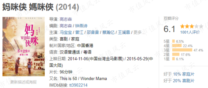 《妈咪侠》是一部低成本艺术片,由黄百鸣的老搭档高志森担任导演,内地票房14万元,境外票房88万元,总票房100多万,豆瓣评分6.1。