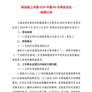 9月28日晚间,上交所科创板上市委公布2020年第83次审议会议结果,吉利汽车控股有限公司(下称“吉利汽车”)申请科创板首发上市通过,顺利拿到了入场券。