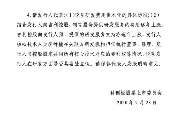 从公告来看,上市委主要聚焦四大问题:要求吉利汽车1、说明新能源汽车板块的发展前景和公司对该板块的战略定位,结合2020年新能源汽车的销售情况,说明新能源汽车业务业绩对公司整体业绩和行业地位的影响,同时说明该业务是否存在发展不及预期的情况。2、说明消除和避免同业竞争、保持公司独立性的具体举措。3、说明吉利控股下属目录公司是否存在无法保持准入资格或受到处罚的风险。4、说明研发费用资本化的具体标准以及专利权的所有权情况,在研发费用方面是否具备独立性。