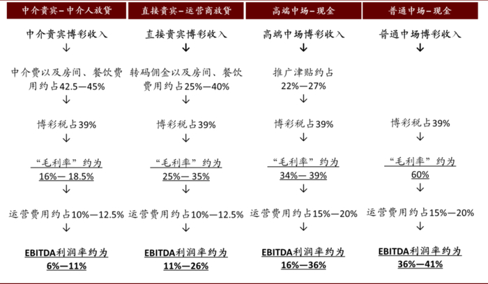 • 澳门博彩粗分为贵宾业务和中场业务两大块。贵宾与中场的经营模式和利润率有较大差异。通常来讲,贵宾业务EBITDA利润率为10%左右,而中场EBITDA利润率高达30%(甚至高于30%),主要由于中场业务不需要付给中介人回佣。澳门博彩运营商最大的现金流出为付给澳门政府的、实际相当于博彩收入39%的博彩税。利润所得税仅就非博彩利润作出缴纳,相对较少。