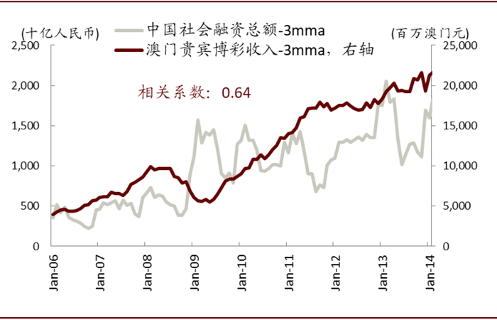 图表: 澳门贵宾博彩收入–3mma vs.中国社融–3mma