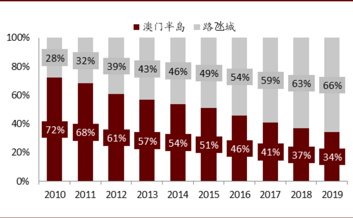►路氹地区的出现源于21世纪初的填海造陆。银河娱乐、金沙中国和新濠国际通过积极拿地在此扎根,并于2002年获得赌牌。路氹地区空间更充足,能够支持大型综合度假村模式的发展。这里有大量高端酒店房接待过夜游客。消费者往往在过夜的酒店进行博彩活动,流动性小于澳门半岛。我们在之后的章节会进一步解释,由于过夜游客人均消费水平更高,路氹地区酒店房间数的增长带动游客结构的改善。我们认为博彩公司将继续投资建设酒店。截至2019年,路氹地区的博彩收入占比和经调整物业EBITDA占比分别达到66%和80%,说明其优于澳门半岛的盈利能力和发展趋势。