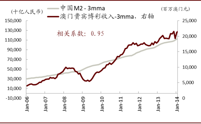 图表: 澳门贵宾博彩收入– 3mma vs.中国M2 – 3mma