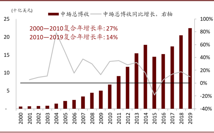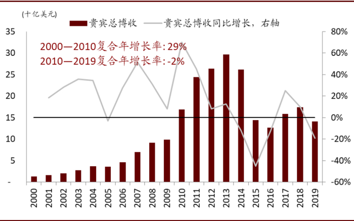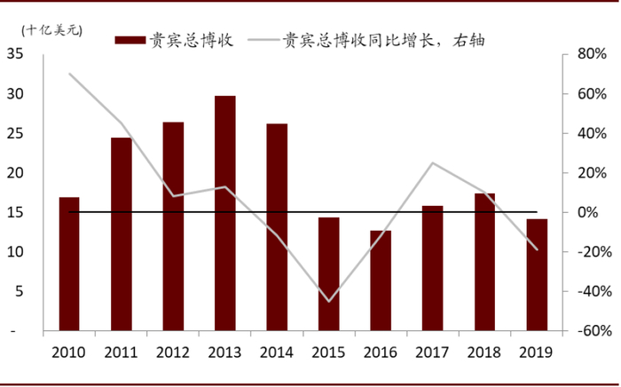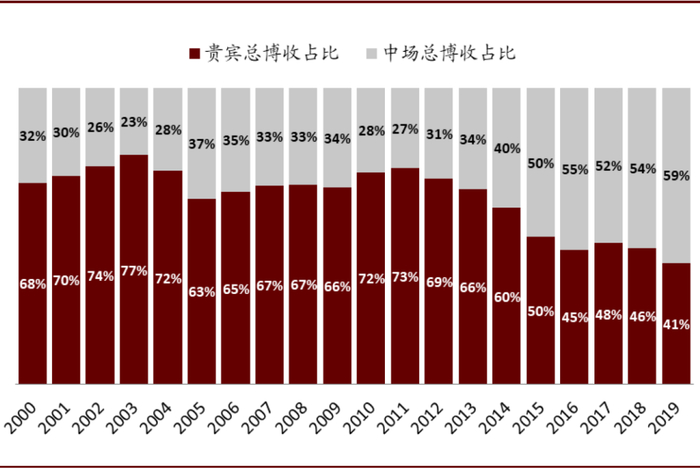 2000至2010年澳门总博彩收入复合年均增长率达28%,其中贵宾博彩收入和中场博彩收入复合年均增长率分别为29%和27%。但最近十年贵宾及中场表现出现分化:2010至2019年总博收复合年均增长率为5%,其中中场为14%,但贵宾为-2%。澳门博彩行业重心从贵宾博彩业务(2000-2013年贵宾占总博彩收入比重超过70%)逐渐转向中场博彩业务,2016年中场博收首次超越贵宾博收,2019年中场博收占总博收比重达到59%。