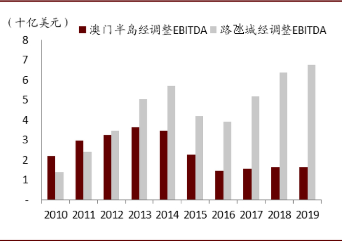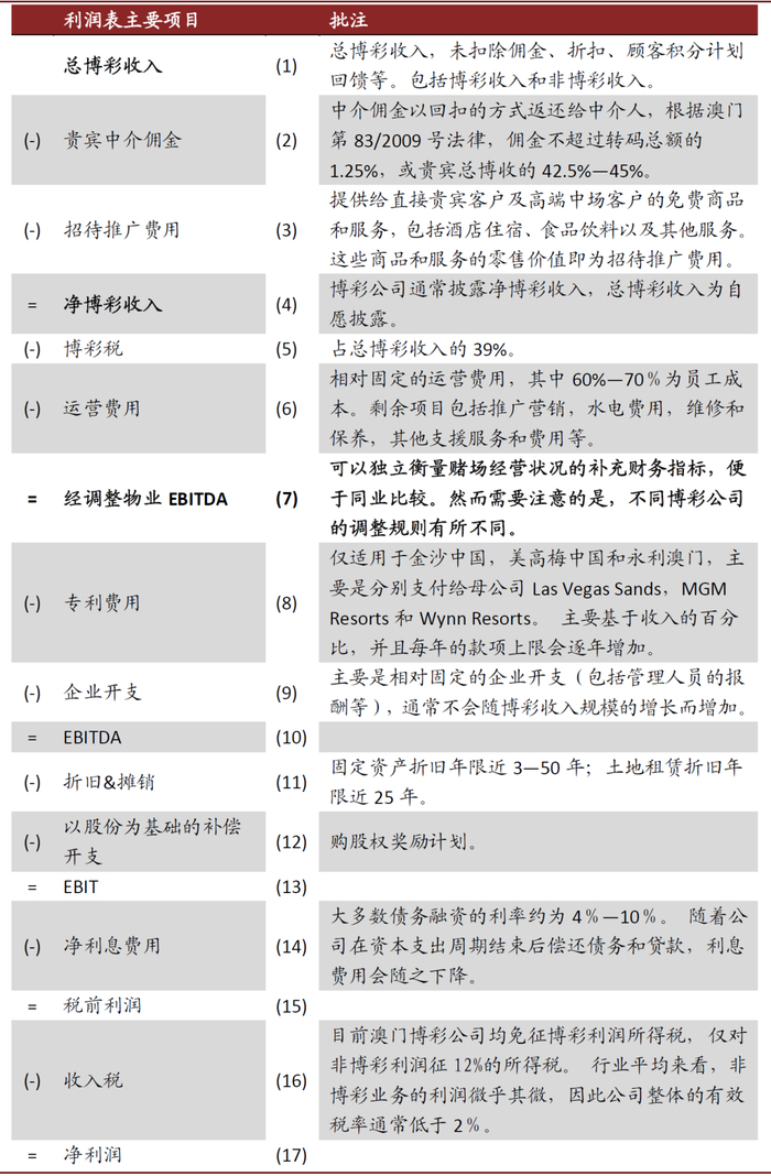 ►为什么博彩公司公布经调整EBITDA而非EBITDA?经调整EBITDA(或经调整物业EBITDA)是剔除股票激励开支、企业开支、开业前开支和其他与特定博彩物业管理不相关的费用的归属于股东的EBITDA。通常认为经调整EBITDA是衡量单个博彩物业经营表现的补充财务指标,更加有助于比较各物业的经营表现情况。经调整EBITDA均值一般高于EBITDA,但各博彩公司间的具体调整项目有所不同。