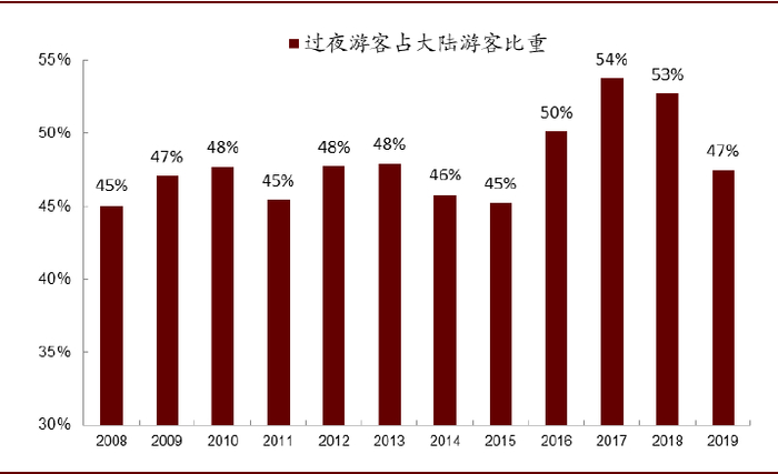 2019年过夜游客人均消费为2,681澳门元,相当于当日往返游客人均消费的3.9倍(680澳门元)。2016年过夜游客数(约占总数的50.7%)首次超过当日往返游客数。过夜游客的强劲增势主要由于2015年酒店房间供应增加。考虑过夜游客的额外消费,以及过夜游客和中场博收间的正相关性,我们认为酒店房间数增加能够延长留澳时间,进一步带动博彩需求的增长。然而,增长潜力可能受到澳门土地容纳能力的限制。我们将在后面的章节中进行讨论。