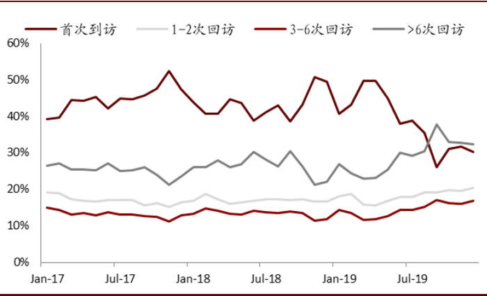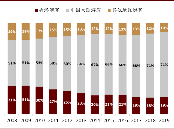 2019年澳门总访客数达到3,940万。从2017年开始大陆和香港游客分别占澳门总访客数的70%和20%左右。如果按访客数/来源地人口粗略估算,香港赴澳门游接近饱和(渗透率达到98%左右),但2019年澳门旅游在大陆的渗透率仅有2%。