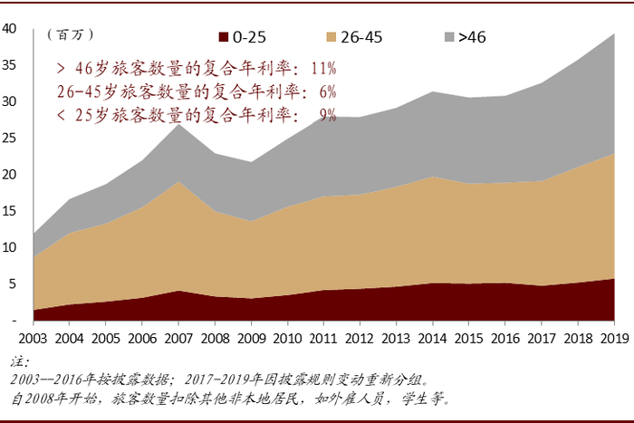 没有人天生是赌客。根据年龄我们将博彩客户粗略分成新赌客(26-45岁)及熟客(46岁以上)。下面的图表显示:1)2019赴澳游客中44%的游客为26-45岁;2)大部分2000年左右的新赌客在20年后已经成为老赌客,年龄超过46岁;3)74%的超过46岁的游客或者63%的青年游客会在半年内再次赴澳门旅游;4)过去几十年新赌客和熟客人数均持续增长。我们认为赌场升级和其他娱乐设施不断更新有助于澳门继续转化和留存年轻赌客。