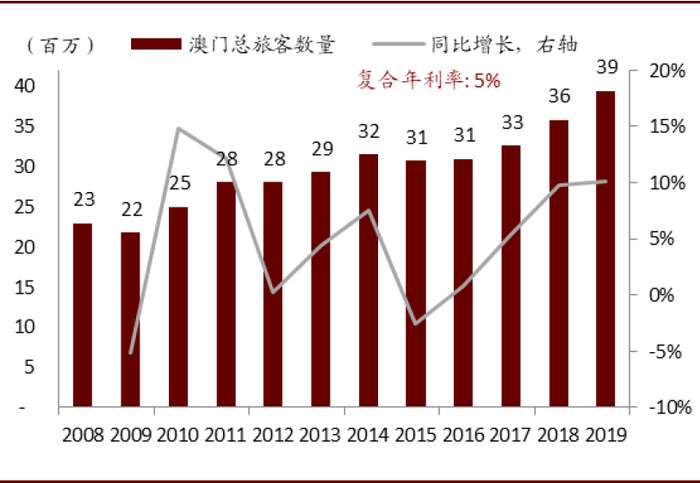 我们认为澳门博彩行业的增长和发展得益于以下几个方面:1)签注政策的支持(如港澳个人游,又称自由行);2)基础设施改善,带动游客数量增长(如港珠澳大桥,高铁网络扩张,以及澳门轻轨等);3)非博彩产品增加和服务能力提升(如酒店房、餐饮服务、购物和娱乐表演等)。