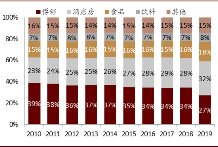 除博彩业务外,澳门的综合旅游度假村还为客户提供其他产品和服务,例如住宿、餐饮、会议和展览服务(MICE)以及其他娱乐产品。但是与博彩收入相比,非博彩收入微乎其微,但是净利润率可能会超过50%。2019年非博彩收入占澳门博彩公司总收入的11%,而同年美国拉斯维加斯博彩公司的非博彩收入份额为73%。由于区域旅游偏好和非博彩设施的不同,澳门和拉斯维加斯之间的收入结构差异较大。我们将在后续章节详细说明和比较。