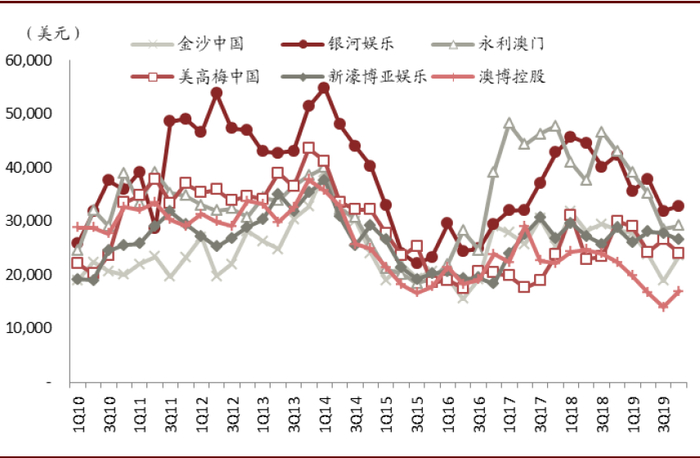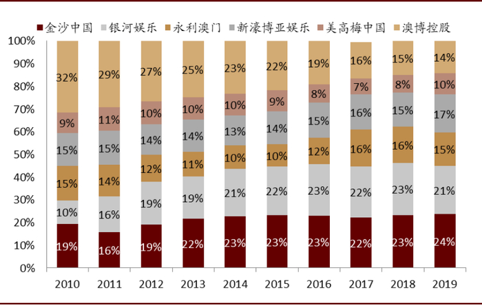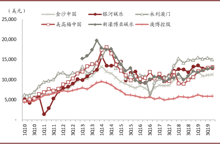 我们认为澳门博彩行业呈现寡头行业的特征:1)市场参与者数量少(共计6家);2)进入壁垒高(如博彩批给、巨额投资承诺等);3)互相依赖,博彩公司在价格和营销上的任何调整都会引发竞争对手的回应(如调整赌台最低或最高下注额);以及4)公司能够保持较高的盈利能力(2019年行业EBITDA利润率为19%,净利润率为14%)。第一批博彩批给将于2022年到期。