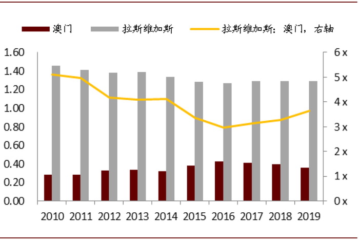 ►澳门游客平均逗留时间受制于客房供应不足。2019年澳门的总访客量为3,940万,只有3.77万间酒店客房可供使用,平均每日每位游客约有0.38间客房。然而拉斯维加斯的14.7万间客房,每日可为每位游客提供约1.3间客房。拉斯维加斯的游客平均逗留时间约为4.4天,而澳门仅为1.2天,我们相信客房数的差异为原因之一。过夜游客的旅游开支通常约为同日往返游客的4倍,因此客房供应的增加至关重要。