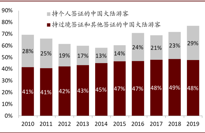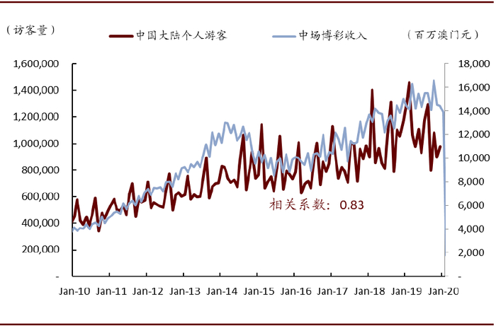 澳门自由行游客占比提升增加旅游消费总量。2019年48%的大陆游客持自由行签注,且过去10年中场博彩收入与自由行游客高度正相关。我们认为自由行游客人数增长将进一步带动中场博彩收入的提升。