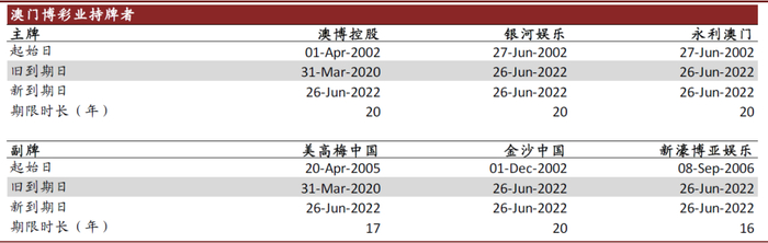 • 澳博至2020年3月31日(第194/2018号澳门特区行政长官批示),因赌牌延期而至2022年6月26日