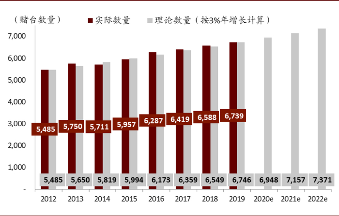 赌台是主要的盈利工具。澳门自2013年开始实行赌台数量限制,要求在2022年12月之前的10年期间,澳门投入使用的赌台数量复合年增长率不得超过3%。此项限制旨在引导澳门博彩需求有序增长并提升盈利质量,自2015年以来澳门不再允许新增贵宾赌台。该规定并未写入法律条文或法规条例,但一直以来严格执行,唯一例外就是澳门银河二期和新濠影汇在2015年4季度开业,当时获批新增400个中场赌台(理论新增上限175个)。此次赌台数量的大幅增长通过后期减少批给进行消化。到2019年已消化完成。
