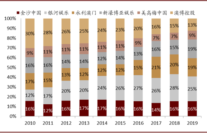 • 澳门博彩业具备寡头垄断市场的种种特征。为数不多的公司(当前为6家)依靠独家牌照运营博彩业务,并通过彼此合作避免价格战、保持行业的高利润率。地理上,澳门赌场始于澳门半岛地区,填海造陆后大型博彩综合度假村于路氹地区崛起,路氹地区逐渐成为新的博彩重心。此外,6家澳门博彩运营商各自展现了不同的发展轨迹。