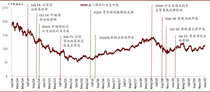 近年来博彩板块平均EV/(经调整)EBITDA是14倍,区间为10倍到18倍。随着博彩批给即将到期,重新竞投的不确定性临近,我们看到当前阶段的估值落入区间中的较低水平。