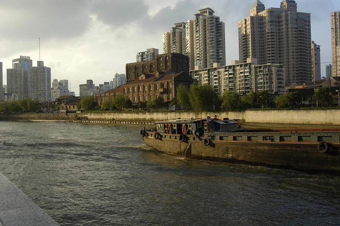 水面的肌理很令人着迷。我记得曾从上海徐汇的西岸看着黄浦江的水面——柔和的、丝绸一般的、变化多端的灰色、粉色、霓彩色,它时刻的变化让人永不厌倦。黄浦江比苏州河宽、深,从表面的变化也能看出水体的深厚。上海的这两条河,仍紧紧地同工业与城市发展贴合在一起,它们承载着观赏目光之外的运输重任,连通着经济命脉。