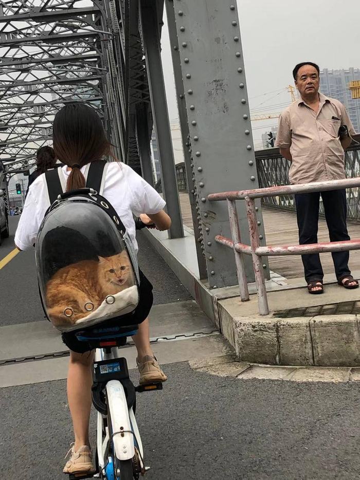 2020年9月19日,浙江路桥,背猫骑车的女孩。澎湃新闻记者 周平浪 图