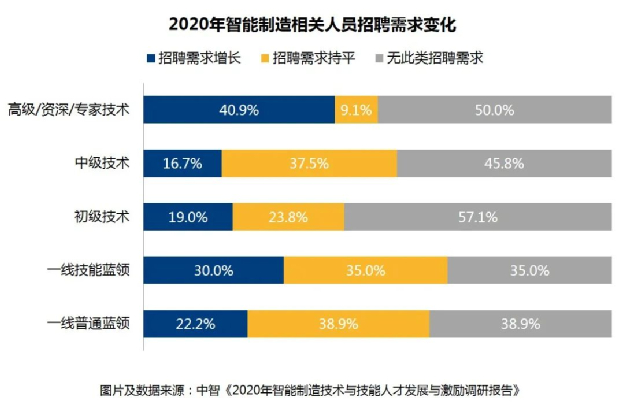 从企业2020年对智能制造相关技术和技能人员的招聘需求来看: