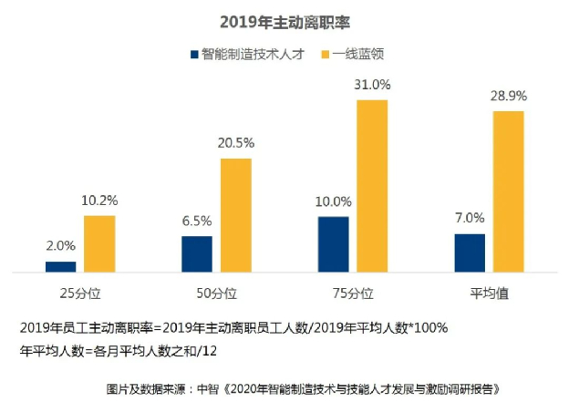 o而在自动化程度高的细分行业,一线蓝领以技能人才为主,年主动离职率基本在20%及以下。