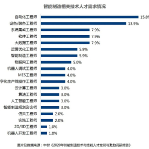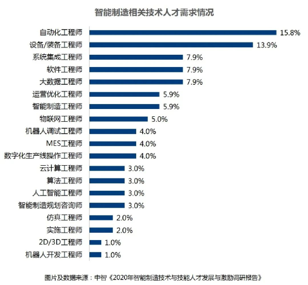 从企业招聘智能制造相关技术人才的需求来看,需求量的前三位依次是自动化类工程师、设备/装备工程师、系统集成工程师、软件工程师以及大数据工程师。